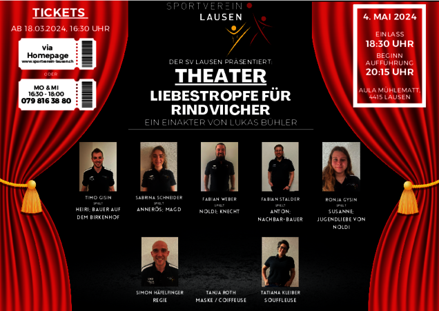 Der Sportverein Lausen führt am 4. Mai 2024 ab 11 Uhr das Jubiläumsfest zu seinem 125-Jährigen Bestehen durch. Am Abend präsentieren einige Aktivmitglieder den Schwank in einem Akt “Liebestropfe für Rindviecher” von Lukas Bühler. Seien Sie dabei und feiern Sie das grossartige Fest mit uns! Wir freuen uns über zahlreiche Gäste, Zuschauer und Delegationen!