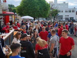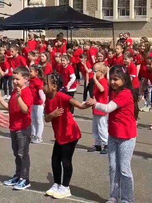 Zu Beginn tanzten 150 Kinder eine kleine Choreographie. Während dem zweiten Lied kamen alle aktiven Mitglieder dazu. Die Kinder und Erwachsenen eröffneten rot gekleidet gemeinsam das Jubiläumsfest des SV Lausen mit einem Flashmob.