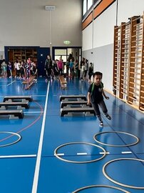 In der Turnhalle spielten wir das Reifenspiel zu lustiger Musik. Die Mädchen durften das neue Märi T-Shirt anziehen und wir versammelten uns zum gemeinsamen Foto.