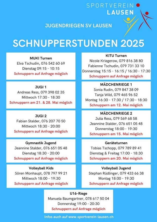 Die genauen Trainingszeiten, Kontaktperson usw. findest du auf der jeweiligen Riegenseite auf unserer Website.