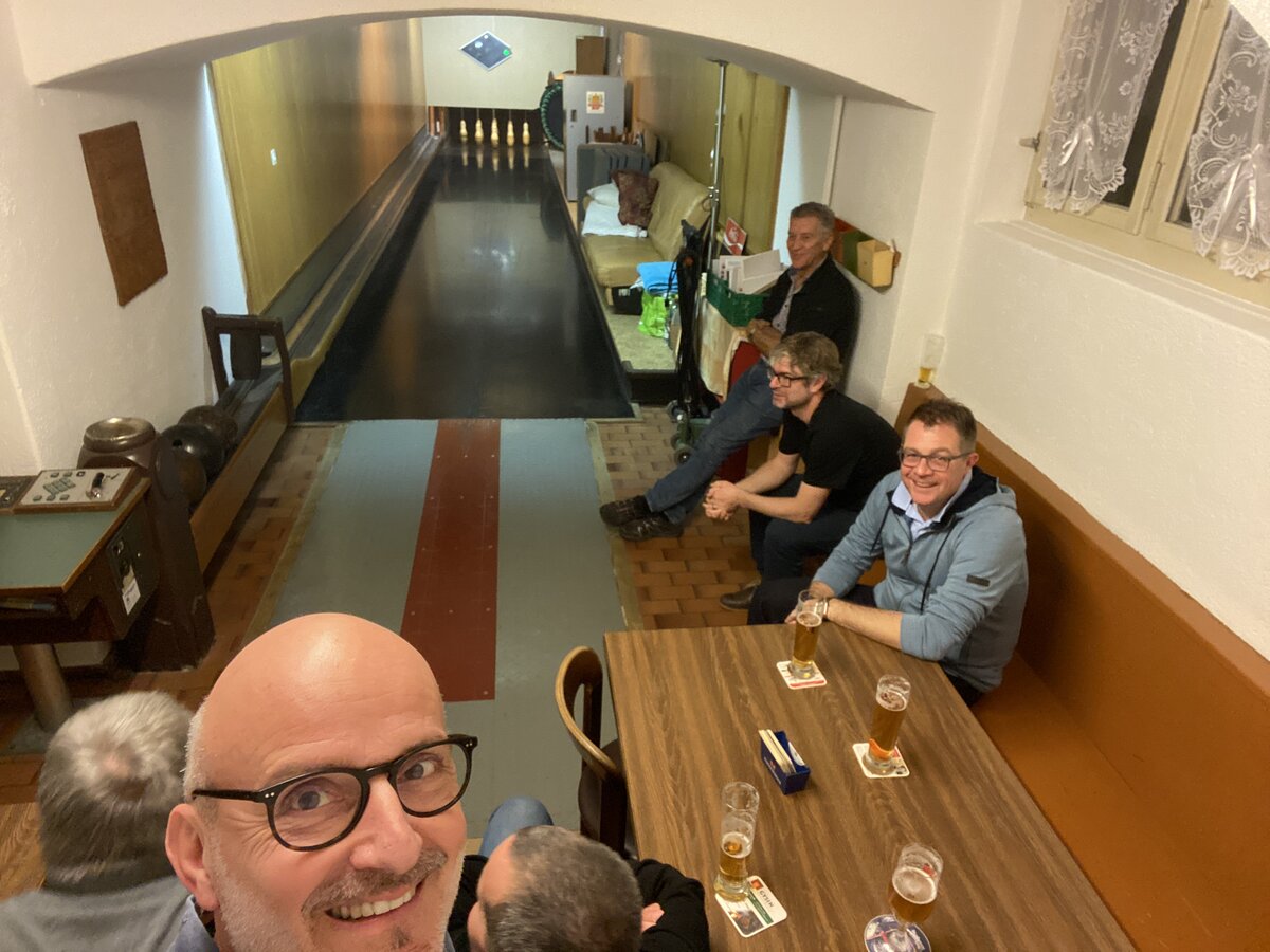 Nach dem Abstieg und einem kurzen Fussmarsch erreichten wir unser Ziel des heutigen Abends, den Bernerhof. Bereits wieder durstig, konnte hier schnell Abhilfe geschaffen werden. Wer sich noch nicht genug ausgepowert hatte, konnte dies beim zweiten Sportteil des heutigen Abends im altehrwürdigen Kegelkeller des Bernerhofs tun. Während die einen schwach begannen und stark nachliessen, kam Dieter mit der Bahn von Anfang an am besten klar (es ging deshalb sogar das Gerücht um, es stehe nicht nur im Werkhof eine Minigolfanlage, sondern auch im Tenn vom Neuhof eine Kegelbahn...).