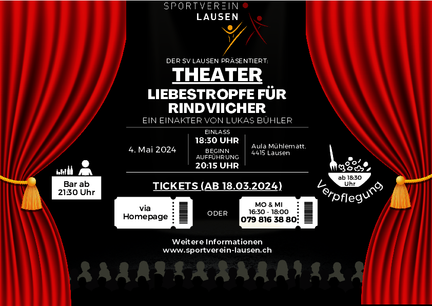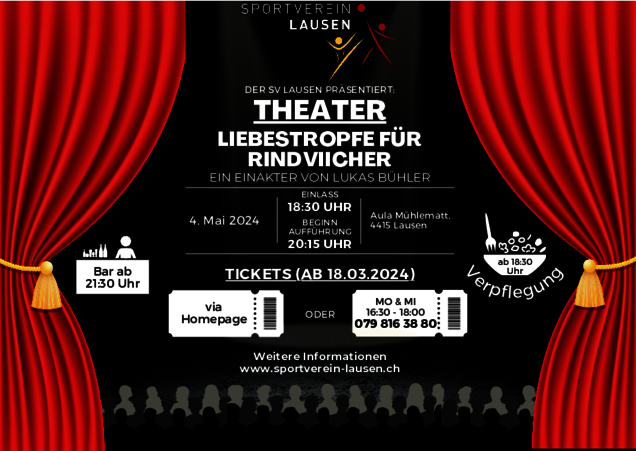 Der Sportverein Lausen führt am 4. Mai 2024 ab 11 Uhr das Jubiläumsfest zu seinem 125-Jährigen Bestehen durch. Am Abend präsentieren einige Aktivmitglieder den Schwank in einem Akt “Liebestropfe für Rindviecher” von Lukas Bühler. Seien Sie dabei und feiern Sie das grossartige Fest mit uns! Wir freuen uns über zahlreiche Gäste, Zuschauer und Delegationen!