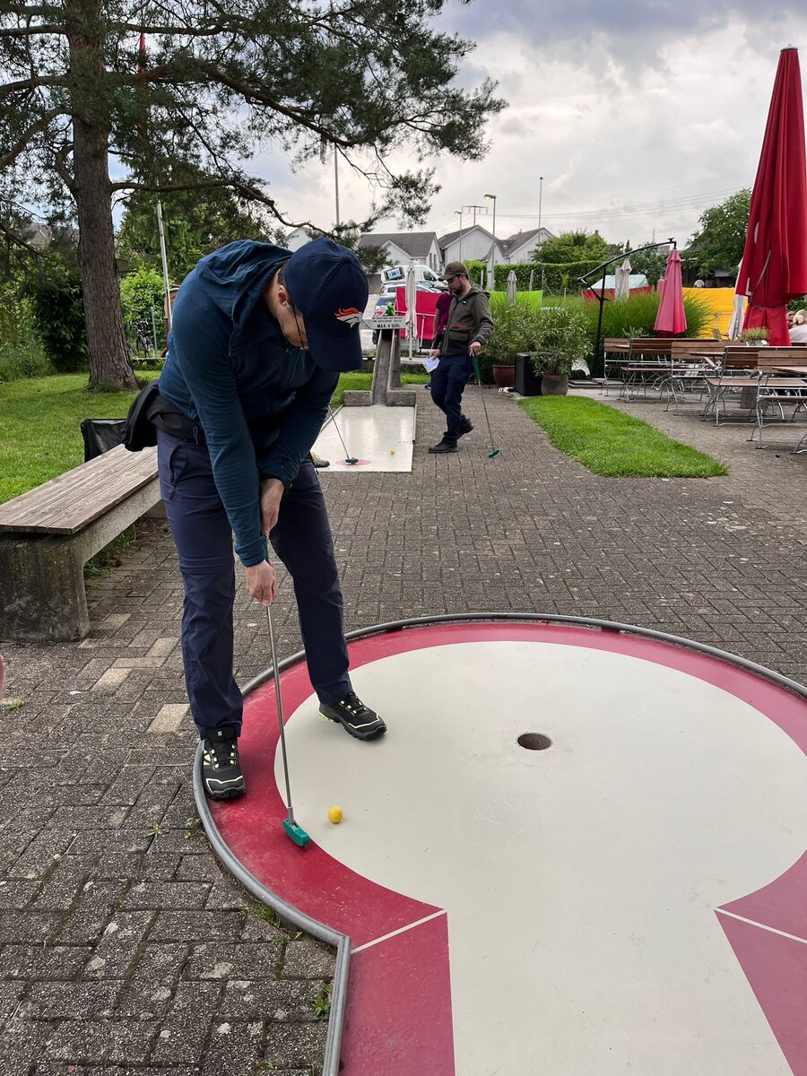 Ausser heute, denn heute stand Minigolf auf dem Programm. Ausgerüstet mit einer flüssigen Stärkung verteilten sich die 13 Teilnehmer auf drei Gruppen und absolvierten den Parcours. Nach ca. 1 Stunde war dieser abgeschlossen und wir freuten uns auf Speis und Trank.