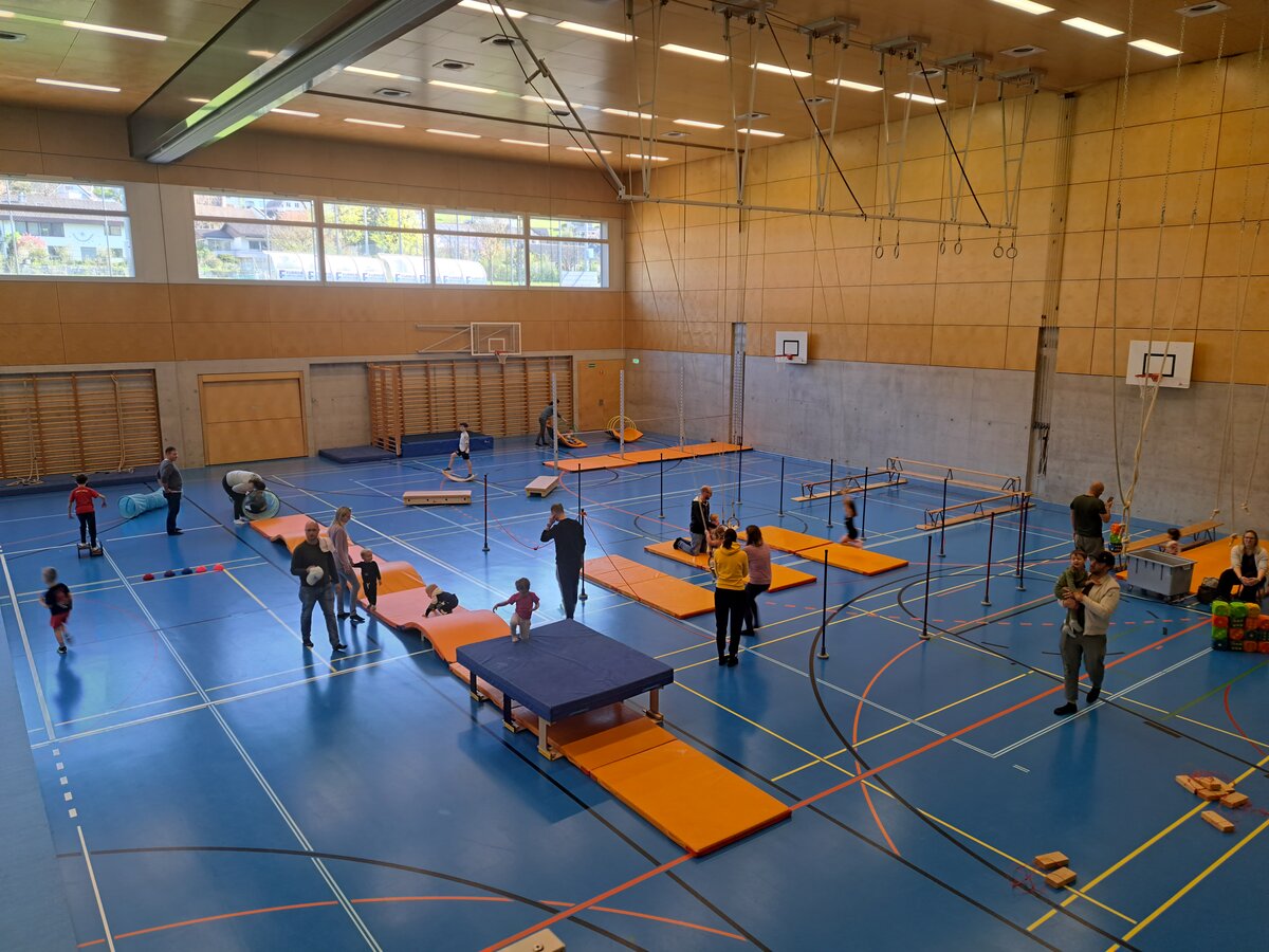 Trotz schönem Wetter fanden viele Familien den Weg in die Stutzhalle, um auf der Bewegungslandschaft zu turnen und zu experimentieren. Es wurde gerannt, geschaukelt, balanciert und gerutscht. Jedes Kind fand eine Aktivität.