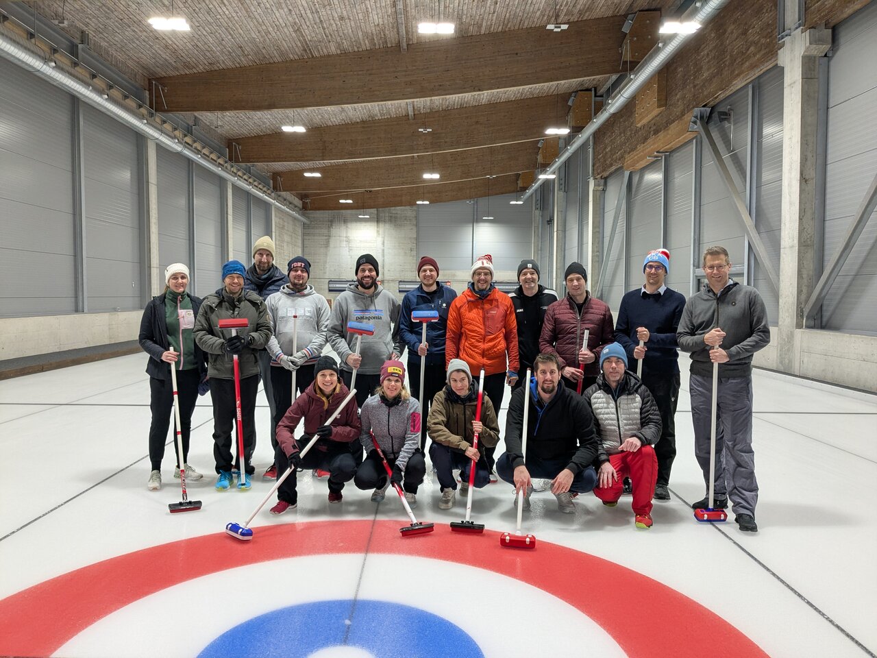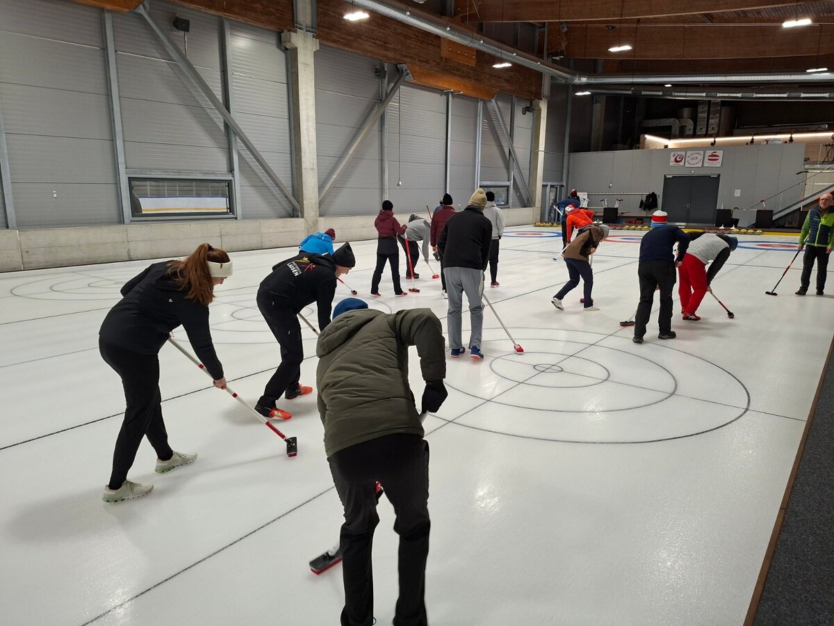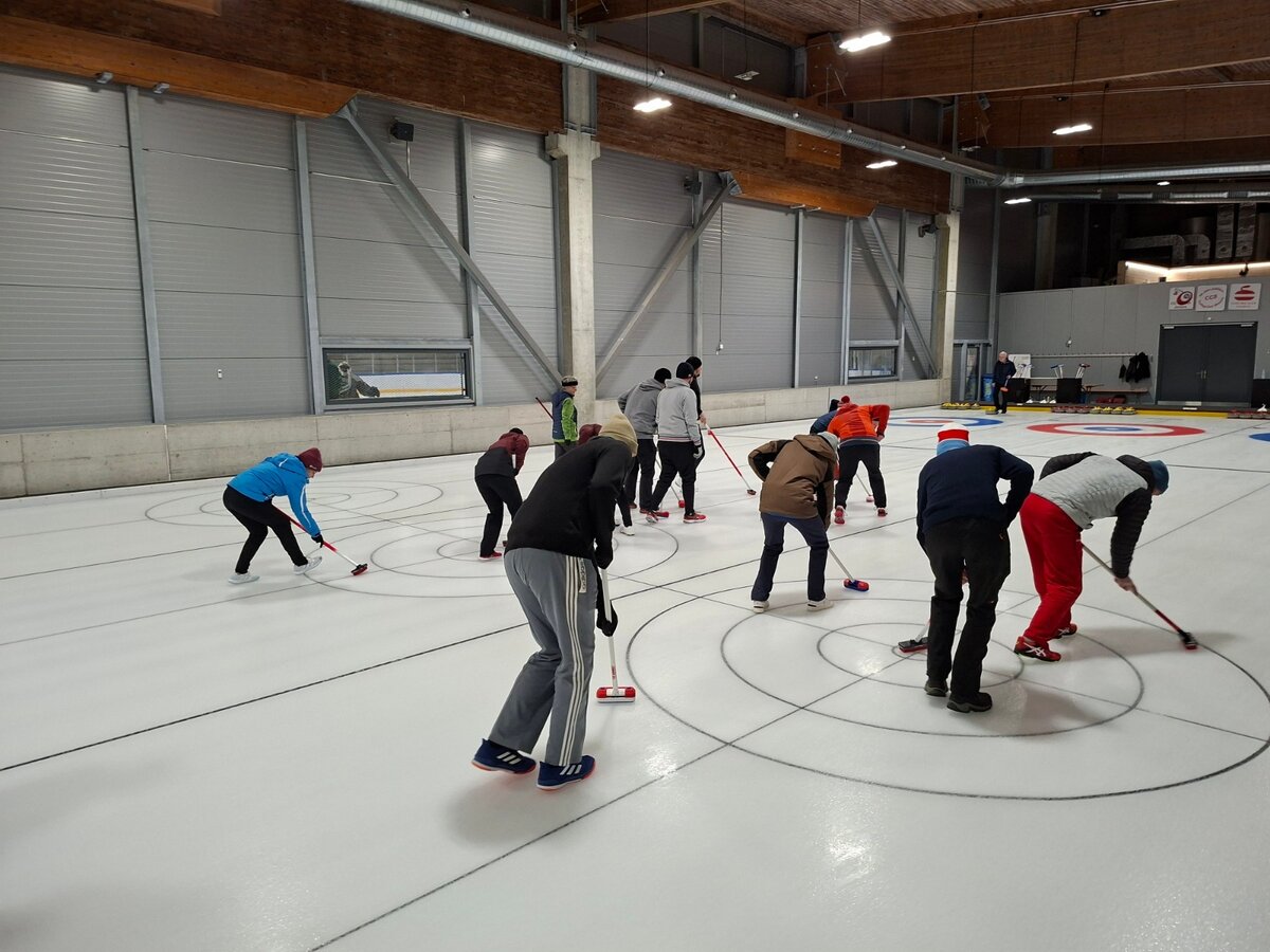 Die 16 Enthusiasten wurden auf zwei Bahnen verteilt, wo wir 4 gegen 4 in gemischten Teams spielten. Uns standen zwei Coaches zur Verfügung, die uns durch den ganzen Prozess begleiteten. Ob wir schon Erfahrung hätten, wurden wir gefragt. Einige meinten, dass die vielen Stunden auf dem Sofa mit Olympia-Schauen doch auch mitzählen sollten, aber da hatten wir uns ein wenig geirrt. So einfach, wie die Profis es im Fernsehen aussehen lassen, ist es nicht: Schon elegant über das Eis zu gleiten ist schwierig, geschweige denn, einen Stein richtig zu stossen!