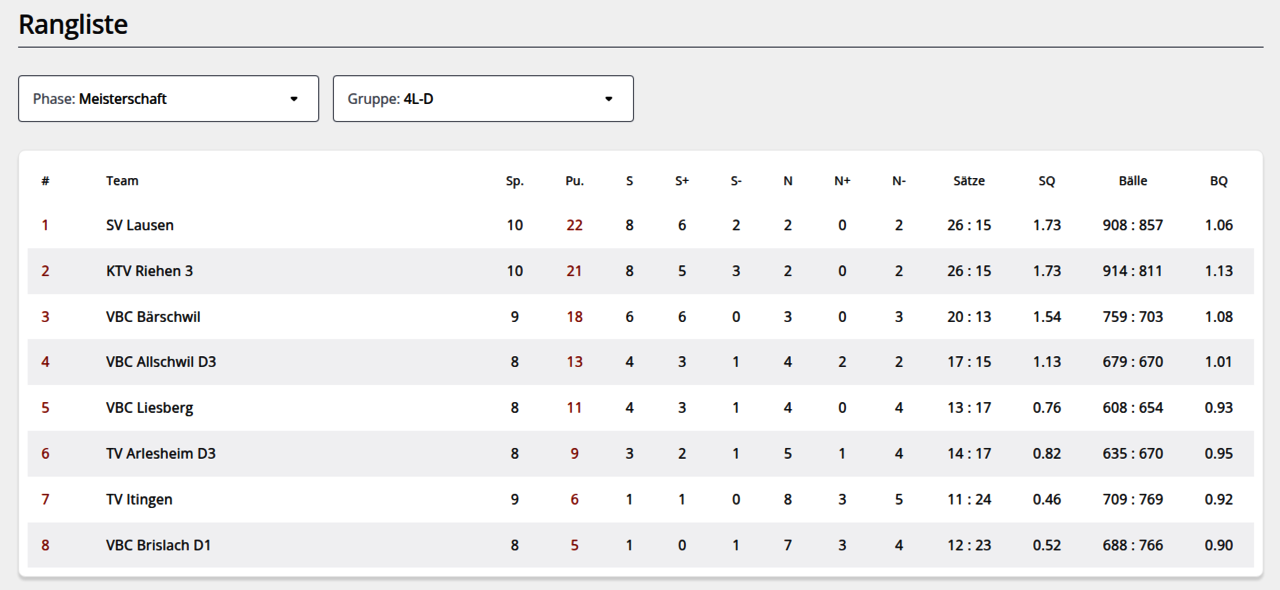 In einem hochklassigen Spitzenspiel der 4. Liga setzte sich der SV Lausen am Sonntag 18. Januar 2026 gegen KTV Riehen 3 mit 3:1 durch. Vor rund 50 begeisterten Zuschauern in der Mehrzweckhalle Stutz lieferten sich beide Teams einen intensiven Schlagabtausch und konnte sich damit die Tabellenführung in der 4. Liga sichern.